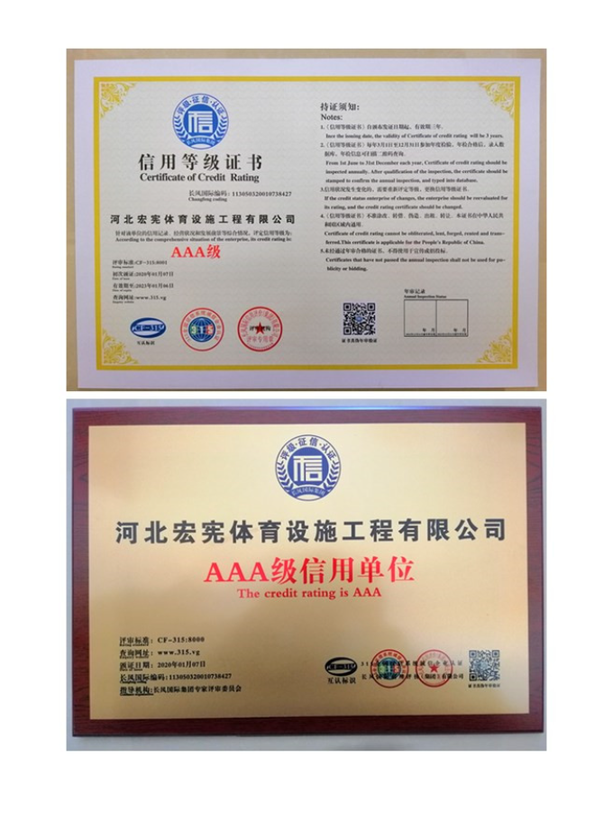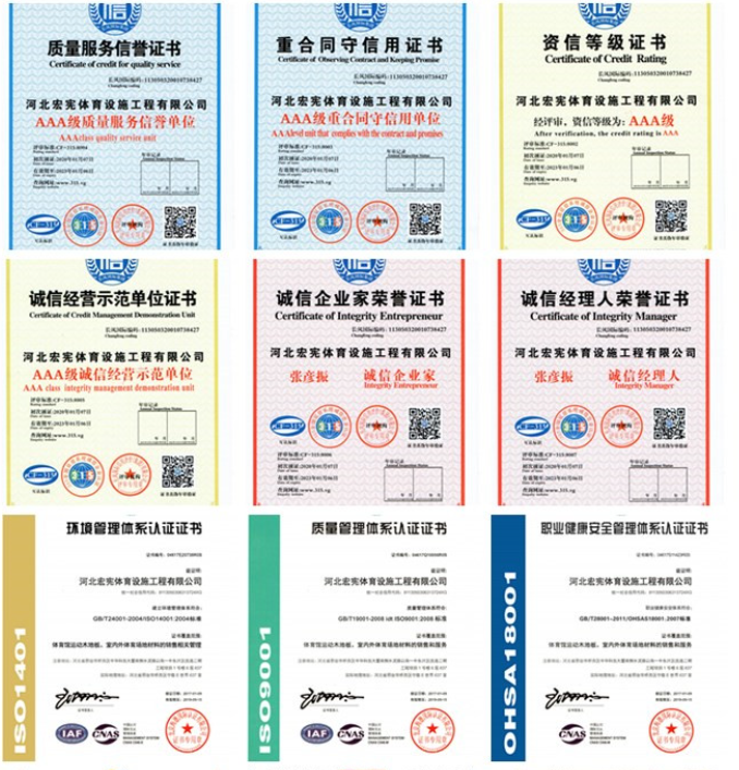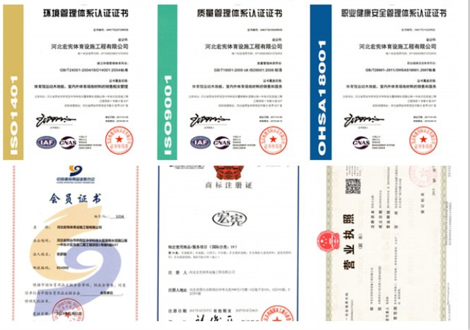 宏憲體育嚴格執行國際、國內有關運動場地建設的標準,規范操作。宏憲體育擁有GB/T19901質量管理體系認證、GB/T24001環境管理體系認證、OHSAS45001職業健康安全管理體系認證體系證書、體育用品會員,綠色環保材料商家等多種國際、國內有關運動產地建設的相關資格認證.